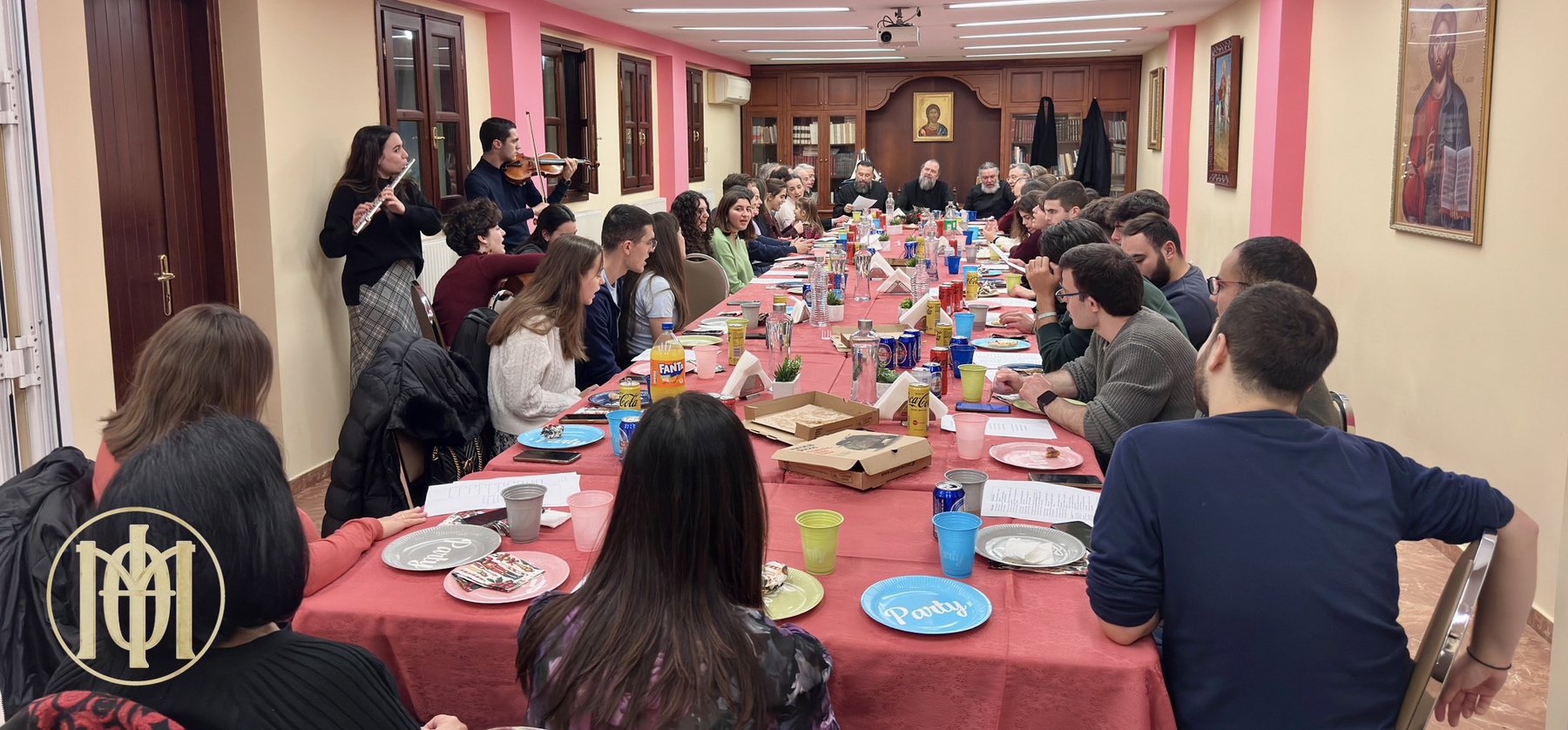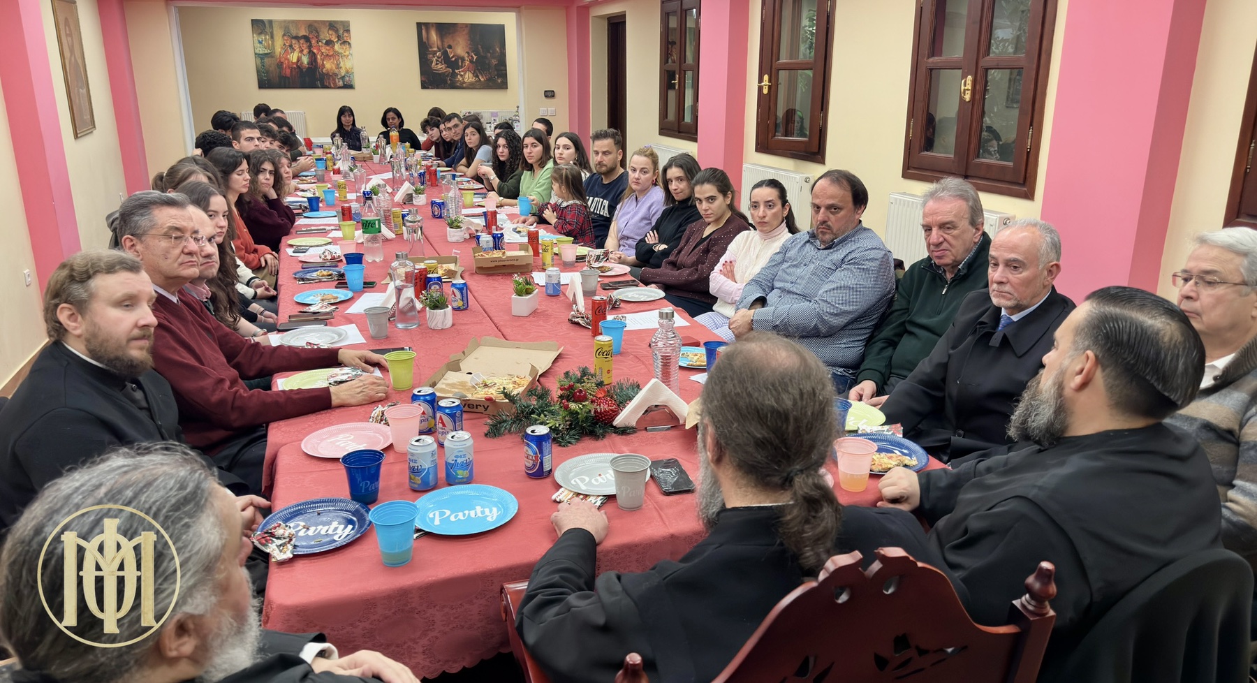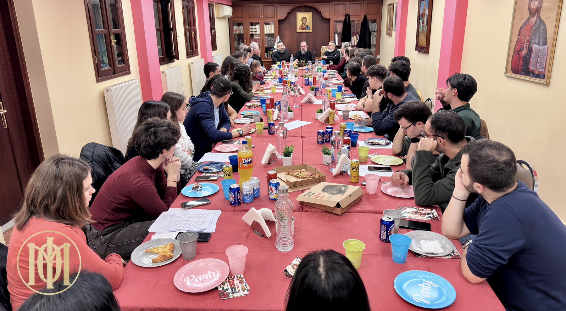 Η σύναξη ξεκίνησε με τρόπο νεανικό και αυθόρμητο, καθώς πριν την τήρηση του πρωτοχρονιάτικου εθίμου, τιμήσαμε πρώτα το δικό μας… «έθιμο» της… «Βασιλό-πιτσας»! Απολαύσαμε το φαγητό μας σε ένα πολύ όμορφο και οικογενειακό κλίμα, συντροφιά με τον Ποιμενάρχη μας.